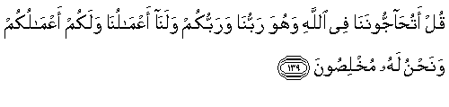 "katakanlah apakah kamu memperdebatkan kami tentang Allah,padahal Dia adalah Tuhan kami dan Tuhan kamu;bagi kami dengan amalan kami dan bagi kamu dengan amalan kamu dan hanya kepadaNya kami serahkan hati kami". (QS. Al-Baqarah-sapi betina-139)