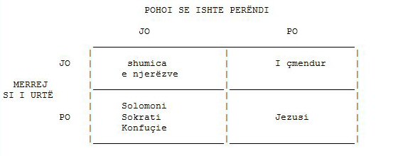 Po përpiqem të parandaloj ndonjë që do të thotë marrëzira që njerëzit shpesh thonë për Të: “Jam gati ta pranoj Jezusin si një mesues të madh moral, por nuk pranoj pohimin e Tij se ishte Perëndi”. Kjo është një nga gjërat që nuk duhet ta themi. Një njeri që ishte thjesht njeri dhe ato gjëra që Jezusi tha nuk mund të jetë vetëm një mësues i madh moral. Ai ose do të ishte lunatik në të njëjtin nivel me atë që thotë se ai është një vezë e zier pa lëvozhgë – ose do të ishte djalli i ferrit. Ju duhet të bëni zgjedhjen tuaj. Ose ky njeri ishte dhe është Biri i Perëndisë: ose ndryshe një i çmendur apo diçka më keq se kaq. Ju mund ta mbyllni atë si një të çmendur, ju mund ta pështyni Atë ose ta vrisni Atë si një demon; ose mund të bini para këmbëve të Tij dhe ta quani Perëndi dhe Zot. Por le të mos e marrim në mbrojtje pa kuptim duke thënë se ishte një mësues i madh. Nuk e ka lënë këtë të hapur për ne. Nuk kishte këtë qëllim. [4]